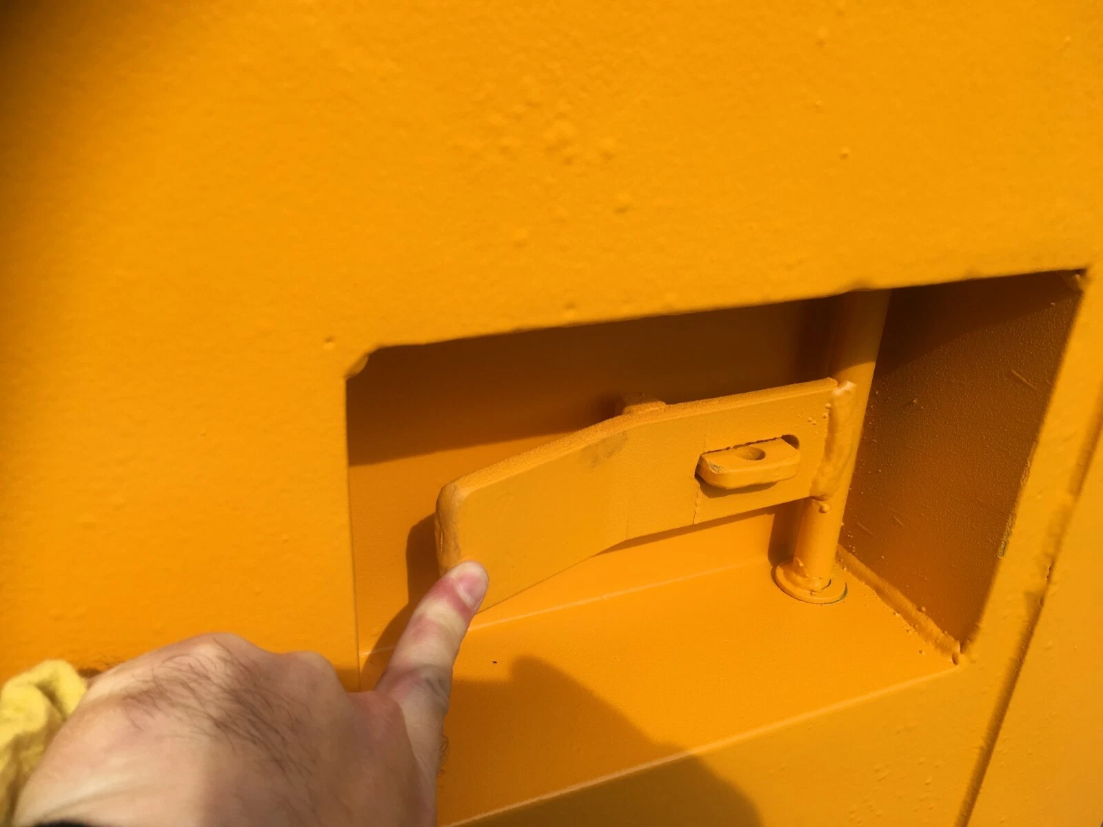 • Heavy-Duty Steel Door: Features a single secure steel door with a clear opening of 910mm x 2080mm, mounted on heavy-duty Bloxwich-style hinges. The door is secured with a pull lever connected to an internal cam bar, locking two steel claws around the door pillar when closed. For extra security, a padlock can be added to secure the lever.