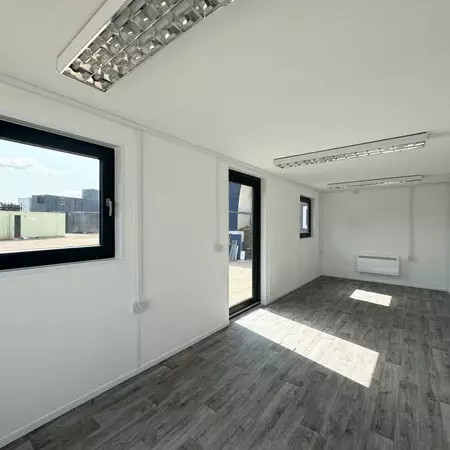 The design includes a fully removed long side, replaced with full-height, double-glazed sliding patio doors, featuring integral Venetian blinds for optimal privacy and light control. The interior is insulated with high-performance 50mm Dritherm Earthwool insulation in the walls and 100mm Dritherm loft insulation in the ceiling, ensuring year-round comfort. It’s finished with 12.5mm plasterboard, prepped and ready for a skim coat or finish of your choice.